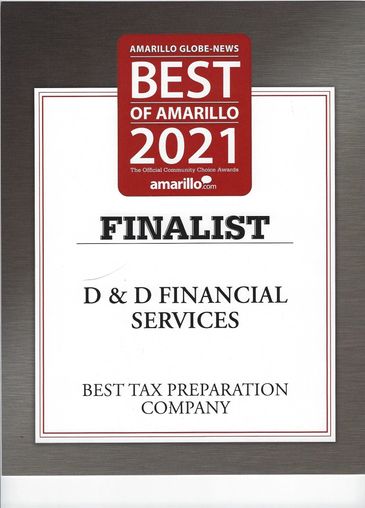 In 2021 D & D Financial Services was named FINALIST in Best of Amarillo for Tax Preparation. That's right, we are TOP 3 of all tax preparation services in all of Amarillo area!